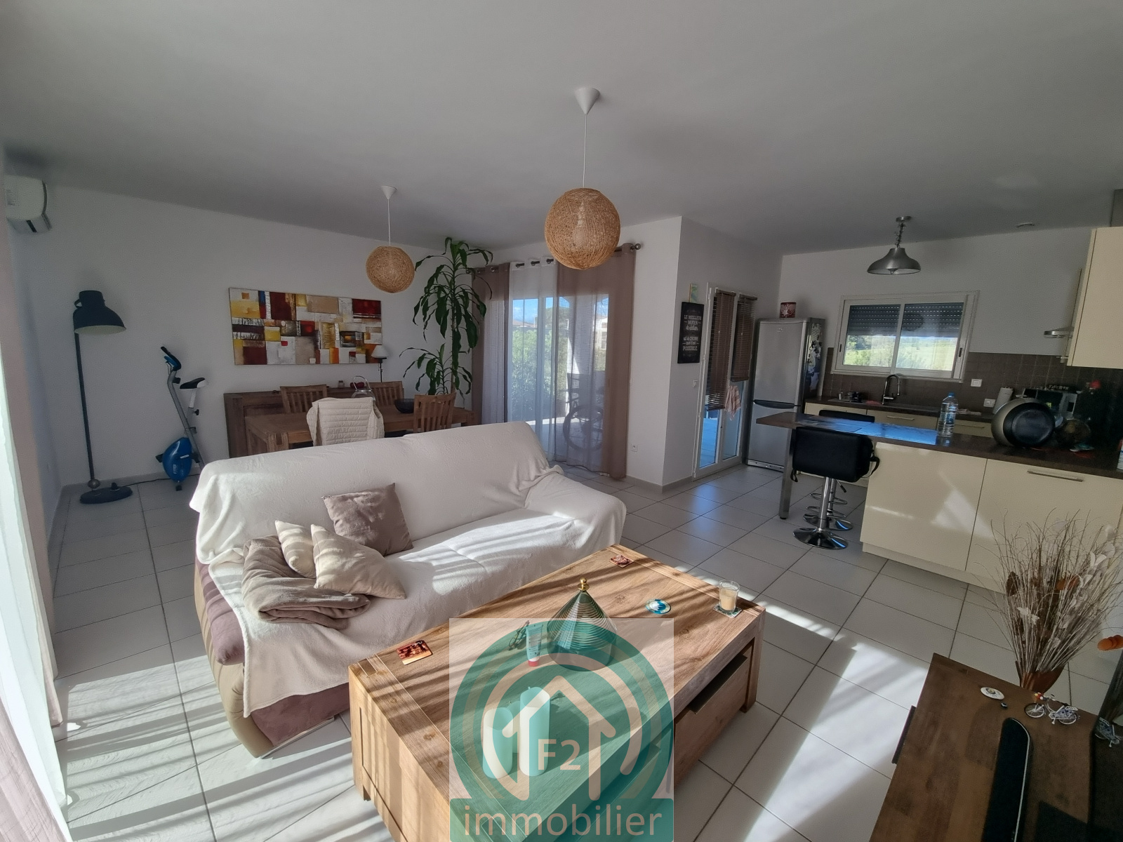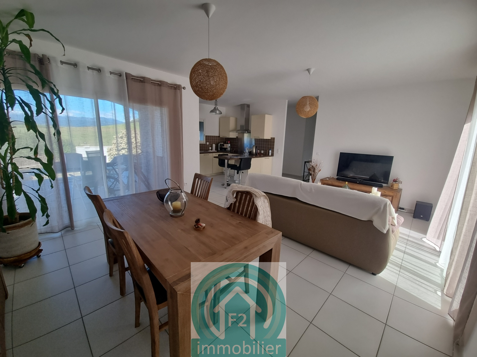 Charmante maison T3 de 80m², comprenant deux chambres, salon et cuisine aménagée ouvrant sur une terrasse couverte et le jardin.